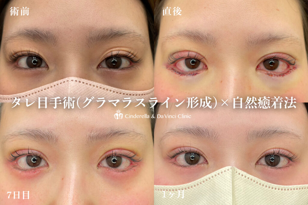 シンデレラ&ダヴィンチクリニックでも、タレ目手術(グラマラスライン形成)と目尻切開を同時に行うケースがあり、目元全体のバランスを見ながら施術方法を組み合わせることを重視しています。