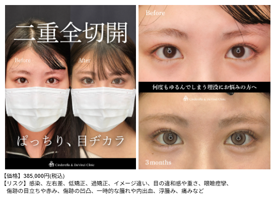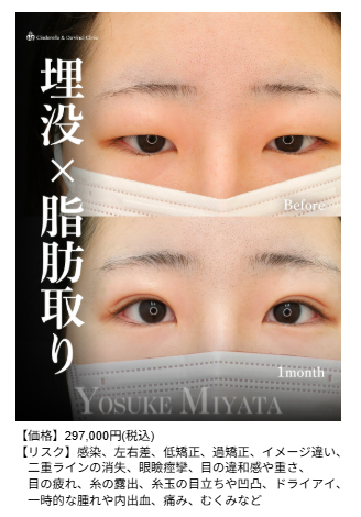 厚みが強く埋没法ではラインが安定しにくい場合に適しています。皮膚や脂肪も取り除けるため、ラインが取れにくく、半永久的な効果が期待できます。
