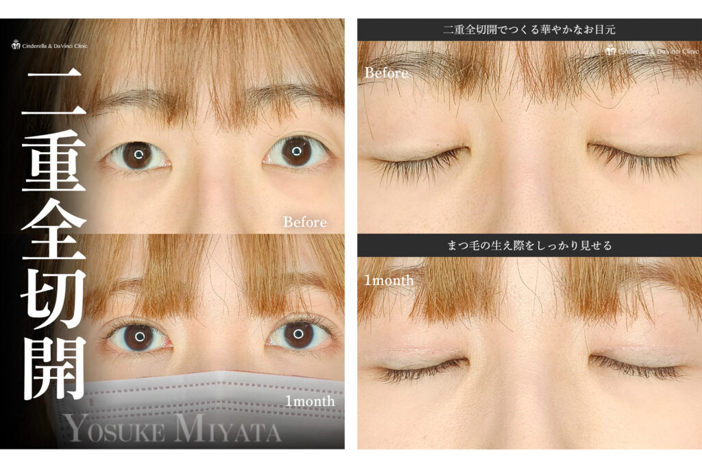 二重全切開法により左右差のない、華やかな目元に仕上がりました。まつ毛の生え際がしっかり見えることで、アイメイクもより映えるお目元です。