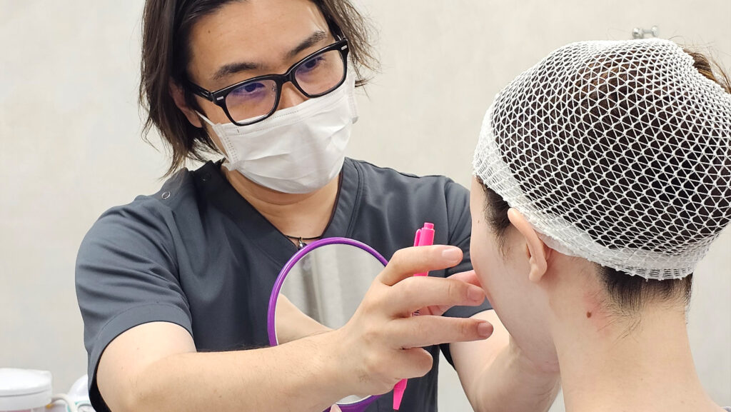 手術当日は、まず手術室で鏡を見ながら、鼻先の位置や高さ、鼻筋のラインなどを最終確認し、皮膚の上からマーキングを行います。