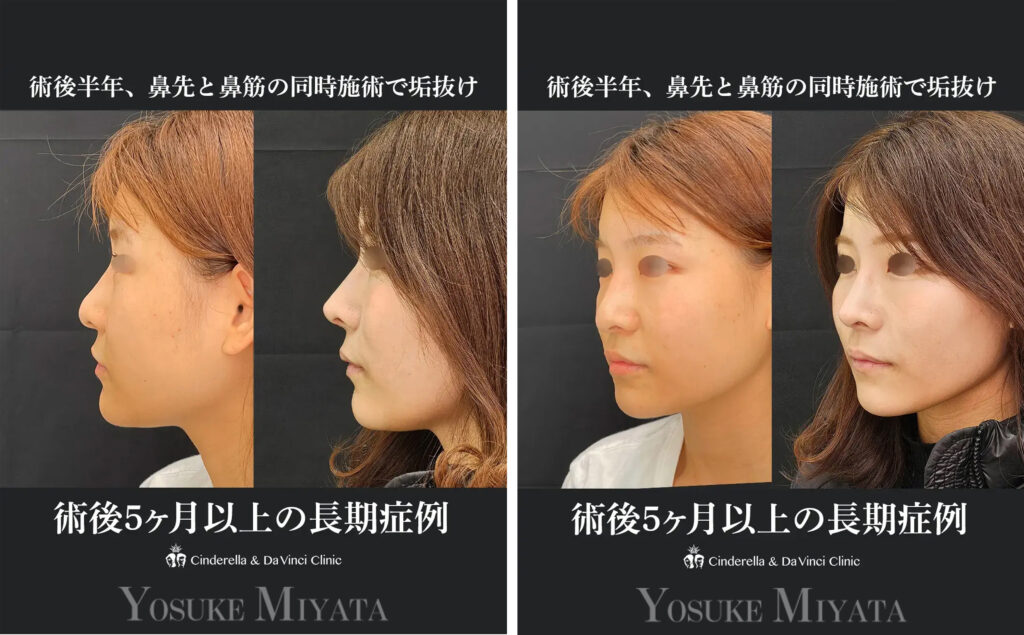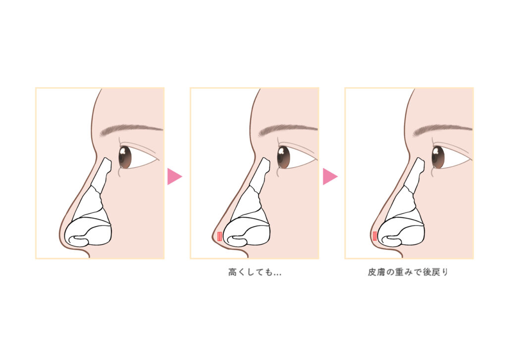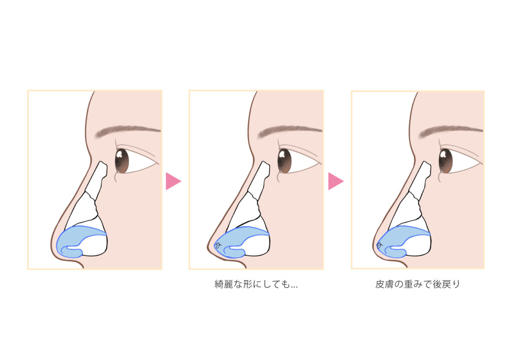 - 鼻尖形成だけで一時的に細くしても、皮膚の重みで逆戻りしやすい