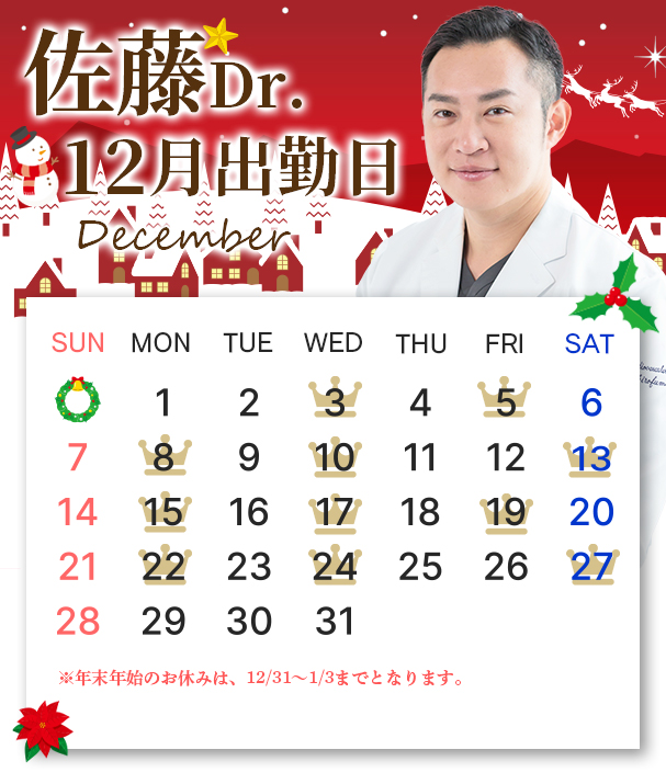12月に施術をご希望の患者様は、医師が出勤していない場合は外科手術を行うことができませんので、本日公開いたしました出勤カレンダーをご確認をください。