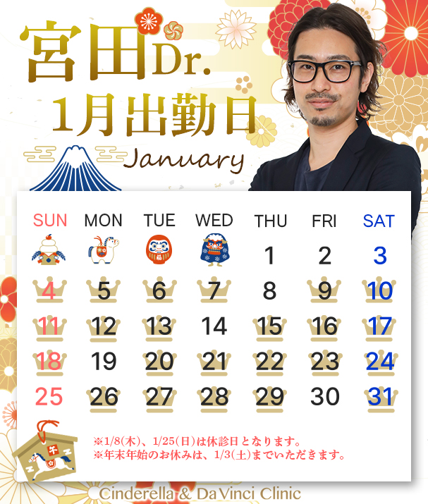 1月に施術をご希望の患者様は、医師が出勤していない場合は外科手術を行うことができませんので、本日公開いたしました出勤カレンダーをご確認をください。
