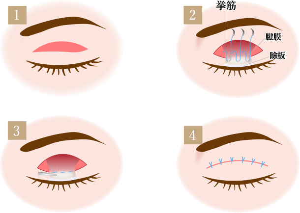 目を開ける筋肉を正しい位置に固定し直すことで目の開きを良くします。